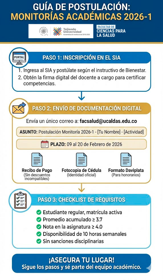 Esta Convocatoria monitorías académicas 2026-1 de la facultad de ciencias para la salud de la universidad de caldas es el trampolín ideal para proyectar tu carrera profesional mientras apoyas a tus compañeros y docentes. ¡No dejes pasar la fecha y postúlate ya!
