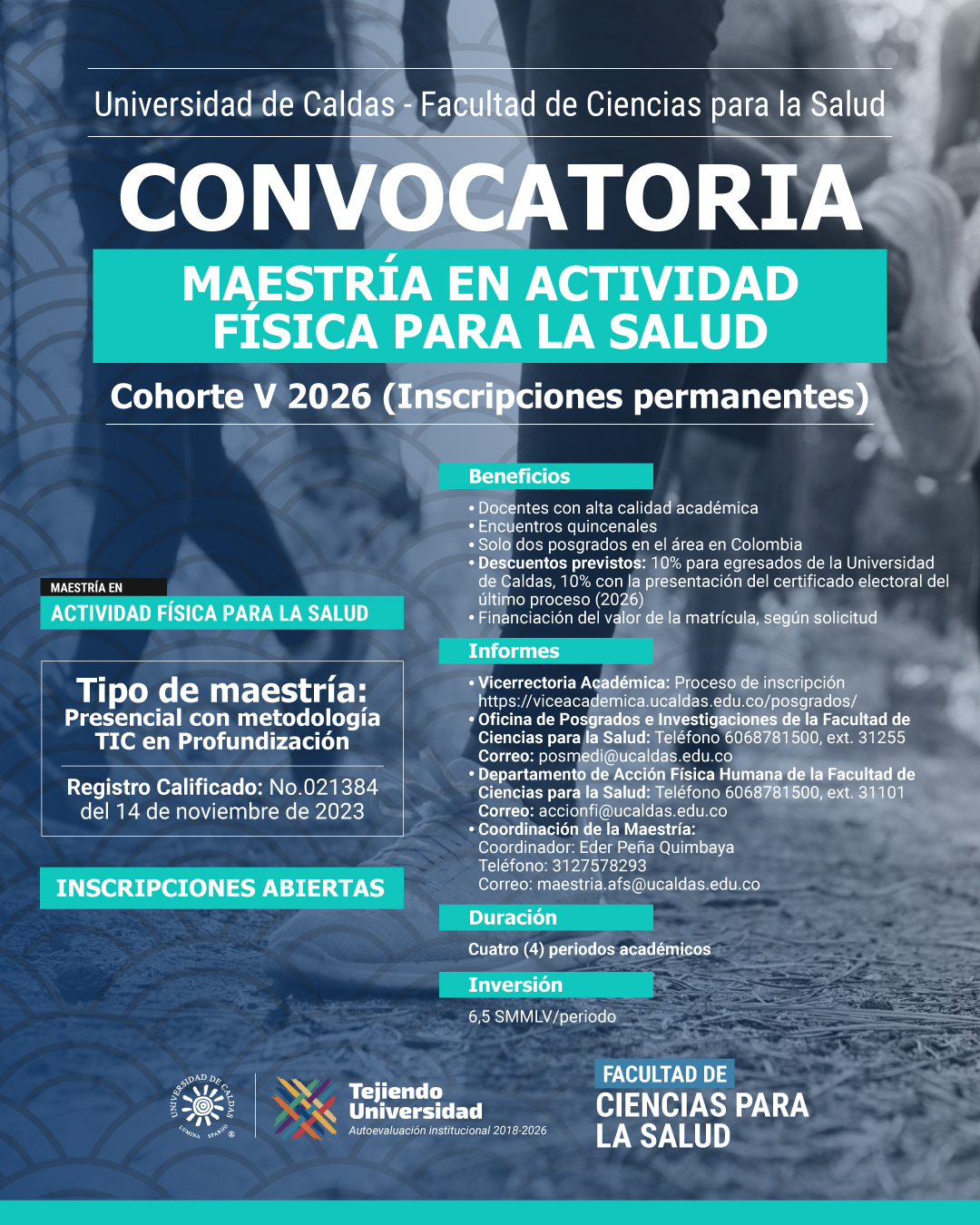 Para obtener más información, puedes contactar al coordinador Eder Peña Quimbaya al teléfono 3127578293 o escribir al correo maestria.afs@ucaldas.edu.co. También puedes visitar la Oficina de Posgrados de la Facultad de Ciencias para la Salud o consultar el sitio web oficial del programa.
